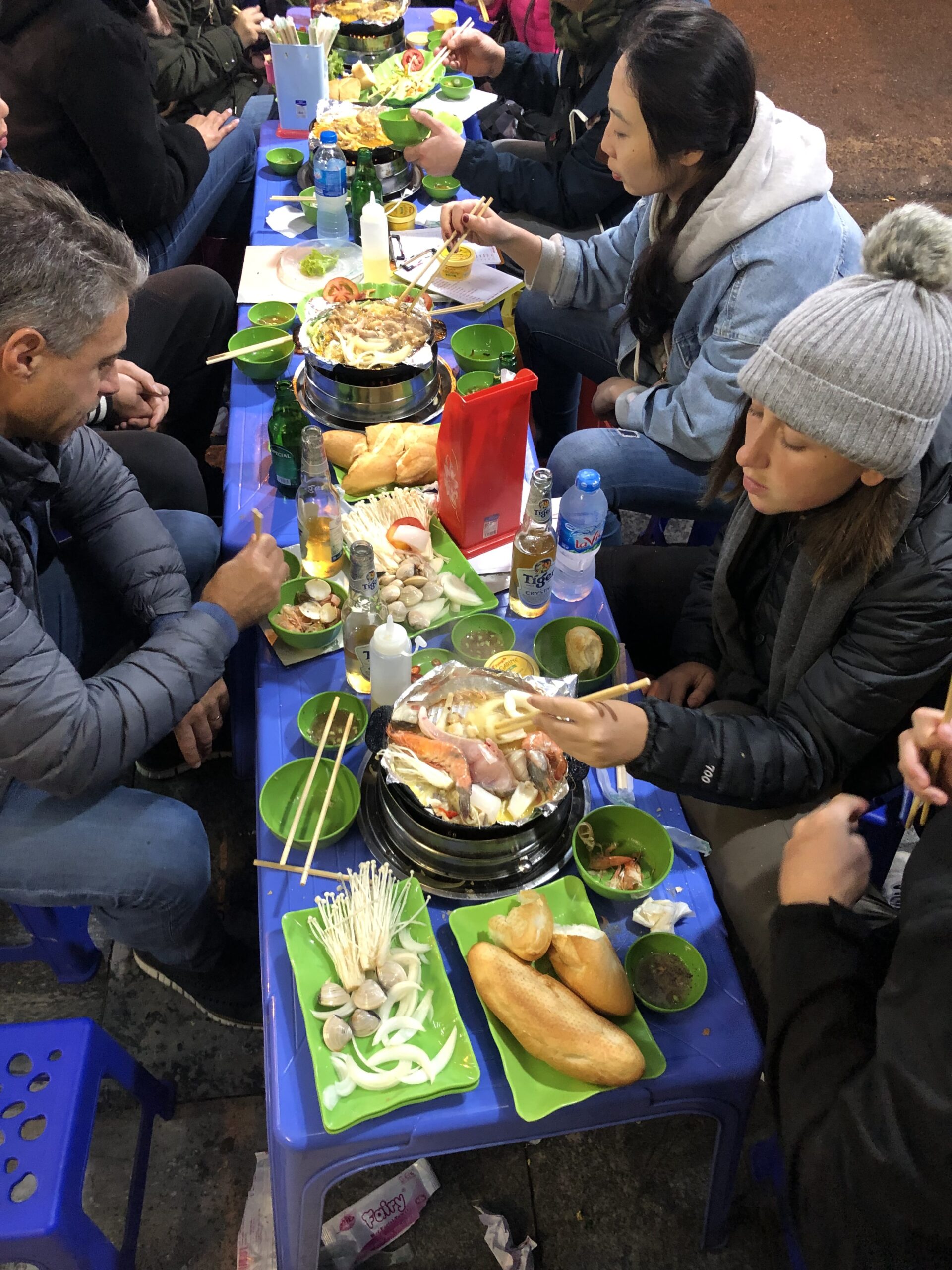 השני, סיור אוכל במהלכו מדריכה וייטנאמית הובילה אותנו בנבכי רחובותיה הסואנים של האנוי, הושיבה אותנו במסעדות מקומיות על שרפרפים נמוכים והגישה לנו את מיטב מאכלי הרחוב של וייטנאם. בעולם האמיתי לא הייתי מעלה על דעתי לטעום אפילו פירור אבל נכנסתי למוד תרמילאות ובאופן מפתיע הכל היה מעולה. וזה כלל פו (pho) מרק בקר עם איטריות אורז שהם אוכלים על הבוקר, באן עם ממרח כבד שהוא סוג של בגט וייטנאמי זכר לימי הכובשים הצרפתיים, מרק עם עשבים ירוקים וקציצות חזיר מתקתקות, ואורז מטוגן עם תירס, ולסיום לחמניות טריות וחמות ישר מהתנור שנקראות רוטי ובביס השני נוזל לך שוקולד חמים לתוך הפה. מושלם. כאמור- בג׳ונגל אכול כפי יכולתך וכן ממחר דיאטה.