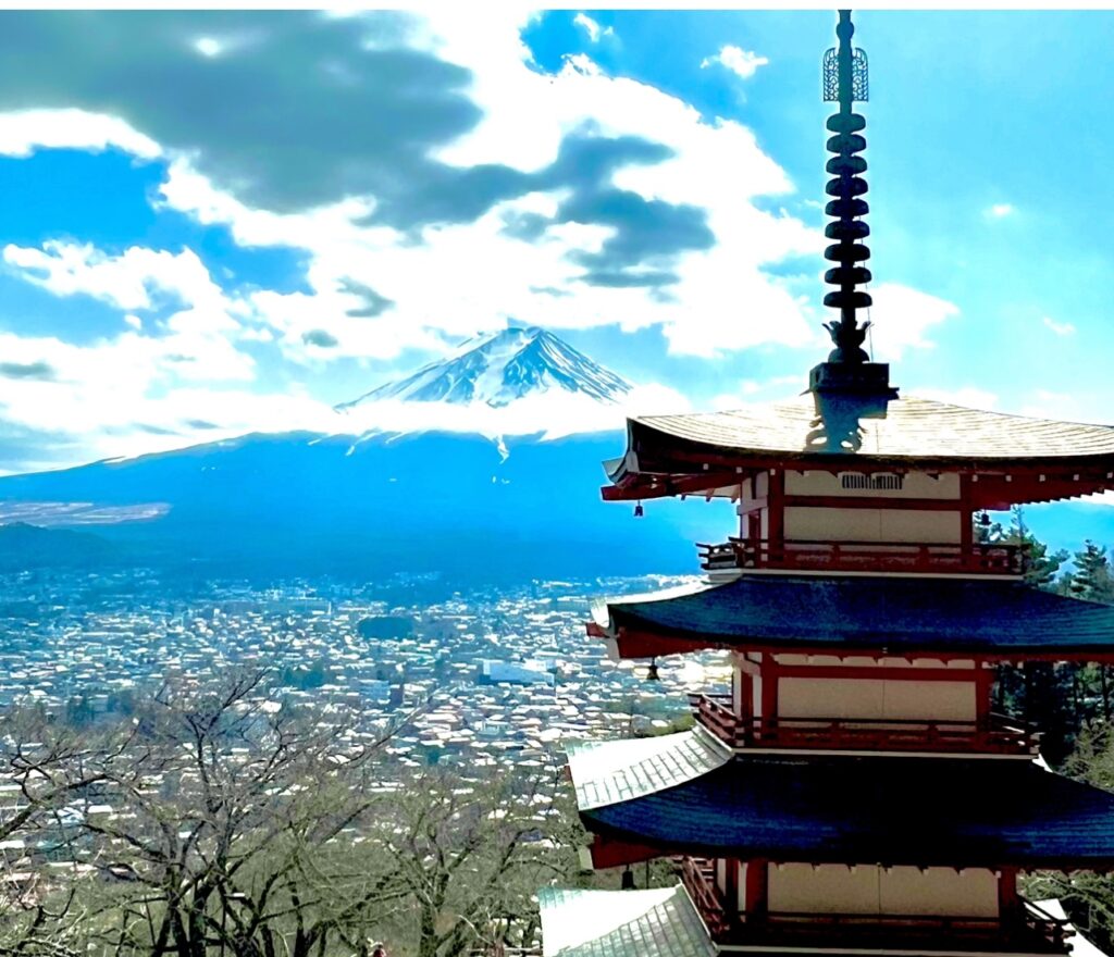 כיאה להיותו מקום קדוש כל כך יש מקדש שינטו שמשקיף עליו וכחלק ממנו יש פגודה בת חמש קומות שנקראת צ׳ירוטו פגודה ומוקפת עצי דובדבן וניבטים ממנה נופים קסומים של פוג׳י. וכדי לחזות בכל היופי הזה יש לטפס לא פחות מ-400 מדרגות. אסף, בשל גילו הצעיר והכושר שפיתח בחודשי קרוספיט וטראקים בהרי ניו זילנד, טיפס במהירות וכשאני התלוננתי מתנשפת כולי על הקצב, הוא אמר שכל הכבוד לי שאני בכלל מטפסת בגילי המופלג וכדי לעודד אותי הוסיף ואמר ״מי שלא נשם אבק דרכים לא ישאף אויר פסגות״.